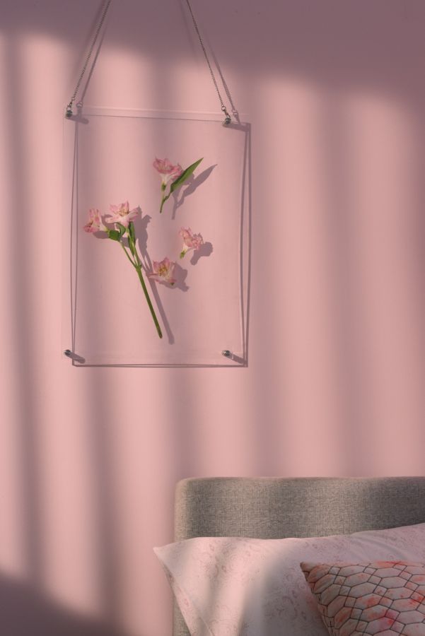 Modern clear acrylic picture frame perfect for displaying art prints, photos, pressed flowers + more. Fit with industrial-inspired rose gold metal hardware, complete with a chain for hanging for a sleek finish.